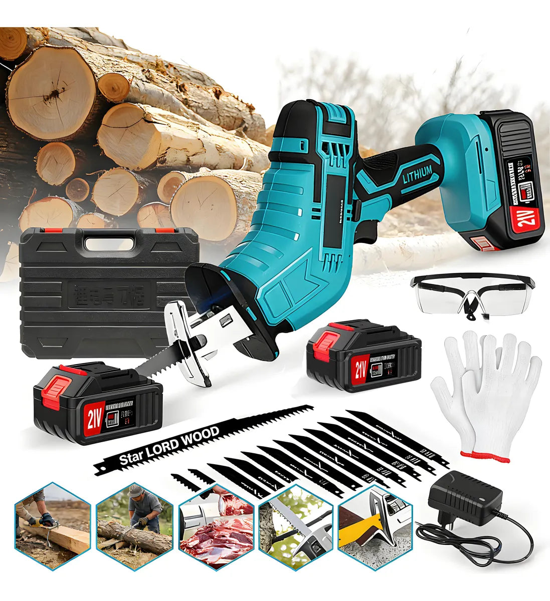 ## Características:## Material: ABS Tipo de batería: LI-Ion recargable Capacidad de voltaje de la batería: 21v 2000 mAh Velocidad sin carga: 0-18500 rpm/min Dispone de la gama más completa de hojas de sierra: 21 ## Paquete: ## --Sierra Recíproca * 1 --Hojas De Sierra de 21 --Batería Recargable * 2 --Maletín De almacenamiento * 1. --Manual De instrucciones * 1 --Gafas * 1 --Guante * 1 --Cargador * 1 ## Ventaja: ## --Usar Puede ser utilizada para aserrar ramas, aserrar metal, aserrar PVC, aserrar madera, etc. --Potente motor cepillado y 18500 RPM: El motor cepillado proporciona más potencia y velocidad para un corte rápido y eficiente con bajo retroceso y vibración, y un 200 % más de potencia. Incluso en un lugar lleno de aserrín y polvo, no tendrá que preocuparse por problemas causados por chispas porque nuestras motosierras no producen chispas. --2*Batería 21 V 2 Ah: Incluye 2 baterías de iones de litio que es fácil de instalar, por lo que puede usarla en cualquier momento y en cualquier lugar. La batería de 2 Ah permite un trabajo continuo durante largos períodos de tiempo. Ideal para una variedad de ocasiones. Y puede utilizar la batería en nuestras otras máquinas (esmeriladoras angulares, hidrolavadora, motosierras, llave de impacto, lijadora oscilante). --Longitud de la Carrera: 0.6 pulgadas (15 mm): Esta es una sierra eléctrica de alta velocidad. La capacidad de corte de madera es de 130 mm, y la capacidad de corte de metal es de 110 mm. Esta herramienta eléctrica es perfecta para trabajos de corte simples. --Diseño Ergonómico: La pequeña sierra eléctrica de sable sin escobillas para cortar ramas pesa solo 1,5 kg, más ligera que las sierras manuales tradicionales. La sierra de sable inalámbrica para cortar madera y metal ofrece un diseño compacto que permite utilizar una potente sierra con una sola mano y es adecuada para todo tipo de condiciones de corte, incluidos los trabajos por encima de la cabeza. El agarre antideslizante de goma reduce eficazmente la vibración y el deslizamiento, reduciendo la fatiga causada por largos períodos de trabajo, proporcionando una experiencia de agarre más cómoda. --Bloqueo De Seguridad Y Engranajes Escalonados: Equipado con un botón de bloqueo como dispositivo de seguridad, para evitar una operación accidental y una función de transmisión sin pasos, puede ajustar la velocidad de corte de acuerdo con las condiciones de trabajo y los materiales. --Reemplace La Cuchilla Con La Herramienta: El mandril gira en sentido contrario a las agujas del reloj e inserte la cuchilla en la profundidad, luego suelte el mandril y el mandril volverá automáticamente a su posición original. Fácil reemplazo de cuchillas sin herramientas --Luces LED: Para la tala de árboles, dispone de luces LED brillantes para iluminar toda la superficie en el área de trabajo, mejorando su visibilidad en entornos oscuros. Esto es especialmente útil para asegurarse de que no se cometen errores y para mejorar la seguridad del usuario. Todo el mundo está preguntando: 1. ¿Los accesorios (seguetas) para sierras se pueden comprar en ferreterías? Respuesta: Sí, la hoja de sierra es universal y se puede usar la hoja de sierra con la misma interfaz. Y podemos recomendarte los enlaces de accesorios (seguetas,batería) para sierras en el chat del pedido. 2. ¿Qué puede cortar? R: Se puede utilizar para cortar madera, material de PVC, metal, huesos grandes y gruesos, bambú, autopartes, tuberías de cobre, ramas, etc. 3. Por qué elegir un motor sin escobillas y cómo reconocer un motor sin escobillas? Motor Sin Escobillas: 1) Larga vida, sin chispa, (sin olor a quemado) 2) Libre de mantenimiento 3) Baja pérdida, gran potencia Garantía del vendedor: 2 meses