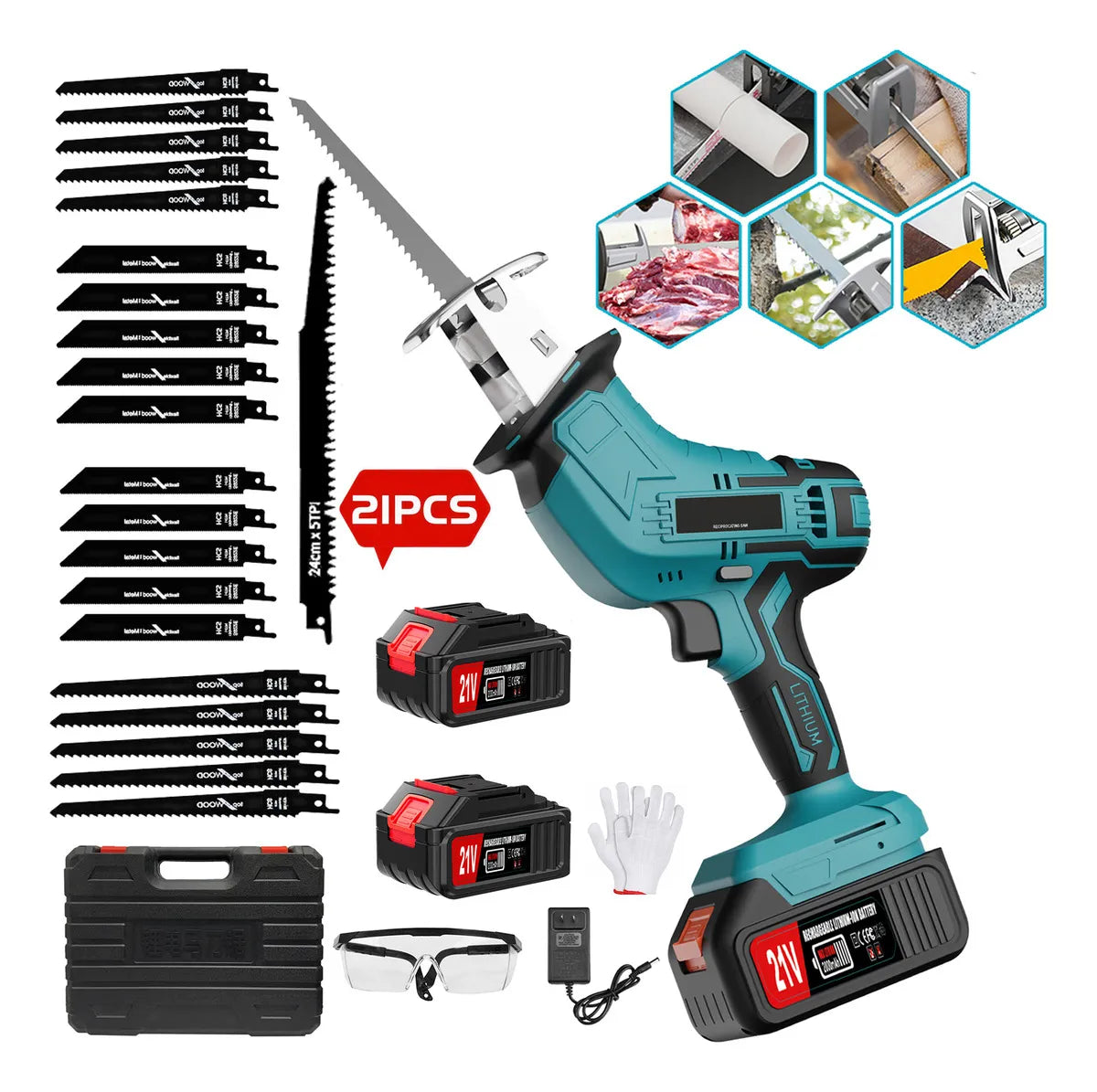 ## Características:## Material: ABS Tipo de batería: LI-Ion recargable Capacidad de voltaje de la batería: 21v 2000 mAh Velocidad sin carga: 0-18500 rpm/min Dispone de la gama más completa de hojas de sierra: 21 ## Paquete: ## --Sierra Recíproca * 1 --Hojas De Sierra de 21 --Batería Recargable * 2 --Maletín De almacenamiento * 1. --Manual De instrucciones * 1 --Gafas * 1 --Guante * 1 --Cargador * 1 ## Ventaja: ## --Usar Puede ser utilizada para aserrar ramas, aserrar metal, aserrar PVC, aserrar madera, etc. --Potente motor cepillado y 18500 RPM: El motor cepillado proporciona más potencia y velocidad para un corte rápido y eficiente con bajo retroceso y vibración, y un 200 % más de potencia. Incluso en un lugar lleno de aserrín y polvo, no tendrá que preocuparse por problemas causados por chispas porque nuestras motosierras no producen chispas. --2*Batería 21 V 2 Ah: Incluye 2 baterías de iones de litio que es fácil de instalar, por lo que puede usarla en cualquier momento y en cualquier lugar. La batería de 2 Ah permite un trabajo continuo durante largos períodos de tiempo. Ideal para una variedad de ocasiones. Y puede utilizar la batería en nuestras otras máquinas (esmeriladoras angulares, hidrolavadora, motosierras, llave de impacto, lijadora oscilante). --Longitud de la Carrera: 0.6 pulgadas (15 mm): Esta es una sierra eléctrica de alta velocidad. La capacidad de corte de madera es de 130 mm, y la capacidad de corte de metal es de 110 mm. Esta herramienta eléctrica es perfecta para trabajos de corte simples. --Diseño Ergonómico: La pequeña sierra eléctrica de sable sin escobillas para cortar ramas pesa solo 1,5 kg, más ligera que las sierras manuales tradicionales. La sierra de sable inalámbrica para cortar madera y metal ofrece un diseño compacto que permite utilizar una potente sierra con una sola mano y es adecuada para todo tipo de condiciones de corte, incluidos los trabajos por encima de la cabeza. El agarre antideslizante de goma reduce eficazmente la vibración y el deslizamiento, reduciendo la fatiga causada por largos períodos de trabajo, proporcionando una experiencia de agarre más cómoda. --Bloqueo De Seguridad Y Engranajes Escalonados: Equipado con un botón de bloqueo como dispositivo de seguridad, para evitar una operación accidental y una función de transmisión sin pasos, puede ajustar la velocidad de corte de acuerdo con las condiciones de trabajo y los materiales. --Reemplace La Cuchilla Con La Herramienta: El mandril gira en sentido contrario a las agujas del reloj e inserte la cuchilla en la profundidad, luego suelte el mandril y el mandril volverá automáticamente a su posición original. Fácil reemplazo de cuchillas sin herramientas --Luces LED: Para la tala de árboles, dispone de luces LED brillantes para iluminar toda la superficie en el área de trabajo, mejorando su visibilidad en entornos oscuros. Esto es especialmente útil para asegurarse de que no se cometen errores y para mejorar la seguridad del usuario. Todo el mundo está preguntando: 1. ¿Los accesorios (seguetas) para sierras se pueden comprar en ferreterías? Respuesta: Sí, la hoja de sierra es universal y se puede usar la hoja de sierra con la misma interfaz. Y podemos recomendarte los enlaces de accesorios (seguetas,batería) para sierras en el chat del pedido. 2. ¿Qué puede cortar? R: Se puede utilizar para cortar madera, material de PVC, metal, huesos grandes y gruesos, bambú, autopartes, tuberías de cobre, ramas, etc. 3. Por qué elegir un motor sin escobillas y cómo reconocer un motor sin escobillas? Motor Sin Escobillas: 1) Larga vida, sin chispa, (sin olor a quemado) 2) Libre de mantenimiento 3) Baja pérdida, gran potencia