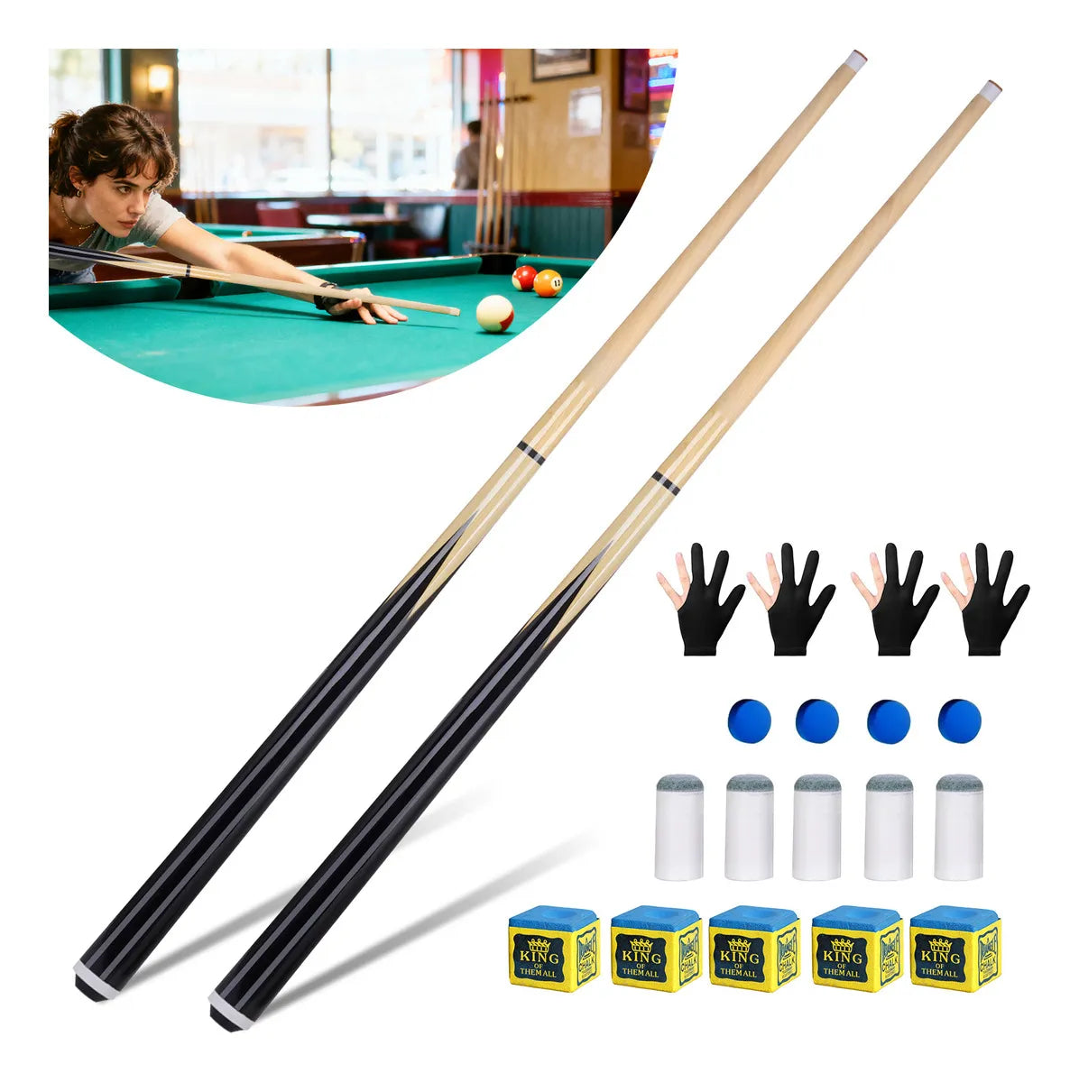 También tenemos el mismo taco de billar, vendido individualmente por solo 119 pesos mexicanos. Enlace: https://www.mercadolibre.com.mx/p/MLM55533518?pdp_filters=item_id:MLM2451906651 Este taco de billar americano es de alta calidad, diseñado para los aficionados al billar. Su diseño sencillo y elegante es práctico y atractivo, ideal para jugadores de todos los niveles. Recibirás 2 tacos de billar, 5 tizas para tacos de billar, 5 casquillos y 2 par de guantes para usar con los tacos de billar. Especificaciones estructurales: Lista de productos: Dos tacos de billar. Los tacos de billar son dos tacos de 1/2" al recibir el producto, que deben combinarse antes de su uso. Tipo: Taco de 1/2" Material: Madera blanca de alta calidad Diámetro de la cabeza del taco: 13 mm Longitud del taco: 145 cm Peso del taco: aprox. 550 gramos Diseño: Estilo sencillo Características: Cabeza de presión, lista para usar: El taco cuenta con una cabeza de presión de alta calidad, fácil de usar desde el primer momento. La cabeza del taco ofrece una excelente durabilidad y estabilidad, lo que aumenta la precisión del taco. Interfaz roscada: El taco cuenta con un diseño de interfaz roscada para garantizar una conexión firme entre las dos partes de la flecha. Este diseño no solo mejora la estabilidad general del taco, sino que también facilita y agiliza el desmontaje y montaje. Tapón amortiguador: Protege el taco: La cola del taco está equipada con un tapón amortiguador para protegerlo eficazmente de daños. Este diseño mejora la durabilidad del taco y prolonga su vida útil. Diseño desmontable: Nuestro taco de billar profesional cuenta con un diseño atornillado, que facilita el desmontaje y montaje. Al atornillar las dos mitades del taco de billar desmontable de arce, se alinean perfectamente, lo que proporciona una eficaz protección antivibración y permite tiros más precisos. Por lo tanto, nuestro taco de billar de dos piezas es adecuado para jugadores de todos los niveles y es fácil de transportar. Excelente estructura: Este taco de billar desmontable, diseñado para jugadores profesionales, cuenta con un diseño integrado con junta de acero que facilita la extracción y reinstalación de la flecha. La base de nuestro taco de billar cuenta con una base de goma diseñada para prevenir caídas e impactos, reduciendo eficazmente el desgaste y haciéndolo más duradero. Materiales de alta calidad: El taco de billar está fabricado con madera de alta calidad, resistente y duradera. Es la opción ideal para jugadores. Este taco de billar profesional es robusto, duradero y flexible, ofreciendo un agarre cómodo y fácil para tiros más precisos. Estos tacos de billar de alta calidad son adecuados tanto para jugadores experimentados como para principiantes. Taco de billar de tamaño perfecto: Cada taco de billar para adultos y niños mide 145 cm (57 pulgadas) de largo y pesa 550 g. La cabeza del taco está revestida con múltiples capas de cuero envejecido y tiene 13 mm (0,51 pulgadas) de ancho. El paquete contiene dos tacos de billar. Nuestros duraderos tacos de billar son desmontables, fáciles de transportar y adecuados para principiantes. Regalo ideal: Este taco de billar de madera es el regalo perfecto para todos los amantes del billar y otros deportes de billar. Regala este bonito taco de billar a tus amigos y compañeros; les encantará. ¡Qué alegría! Escenarios aplicables: Ideal para diversas salas de billar, entretenimiento en casa y la práctica diaria para los aficionados al billar. Ya sea para un juego formal o para el ocio, este taco es la opción ideal.